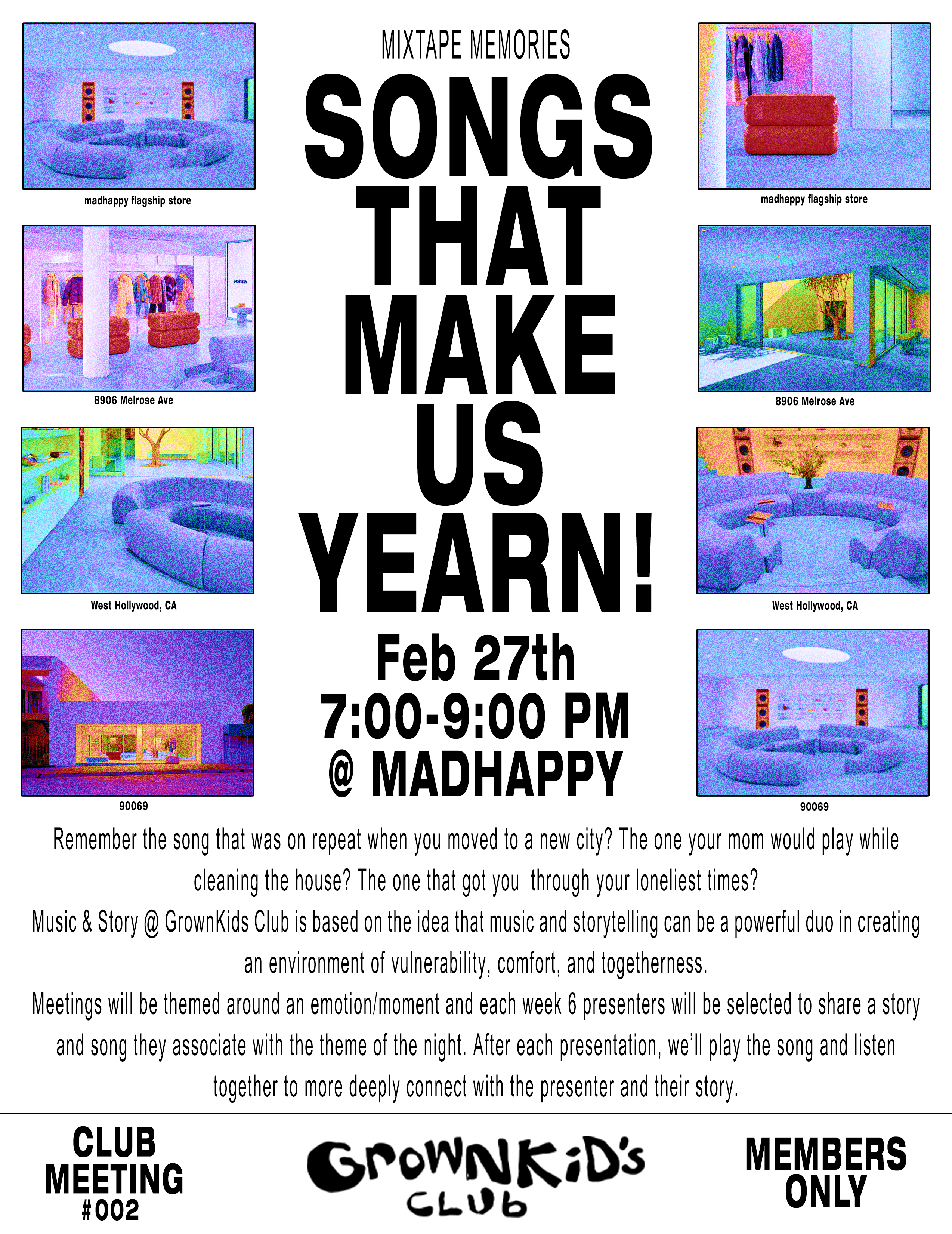 midnight memories turns madhappy LA into a shared living room - dim, warm, and full of people leaning in. the large speakers hum through the space as eight speakers open up about the moments that changed them: the heartbreaks, the identity spirals, the turning points, the quiet realizations.