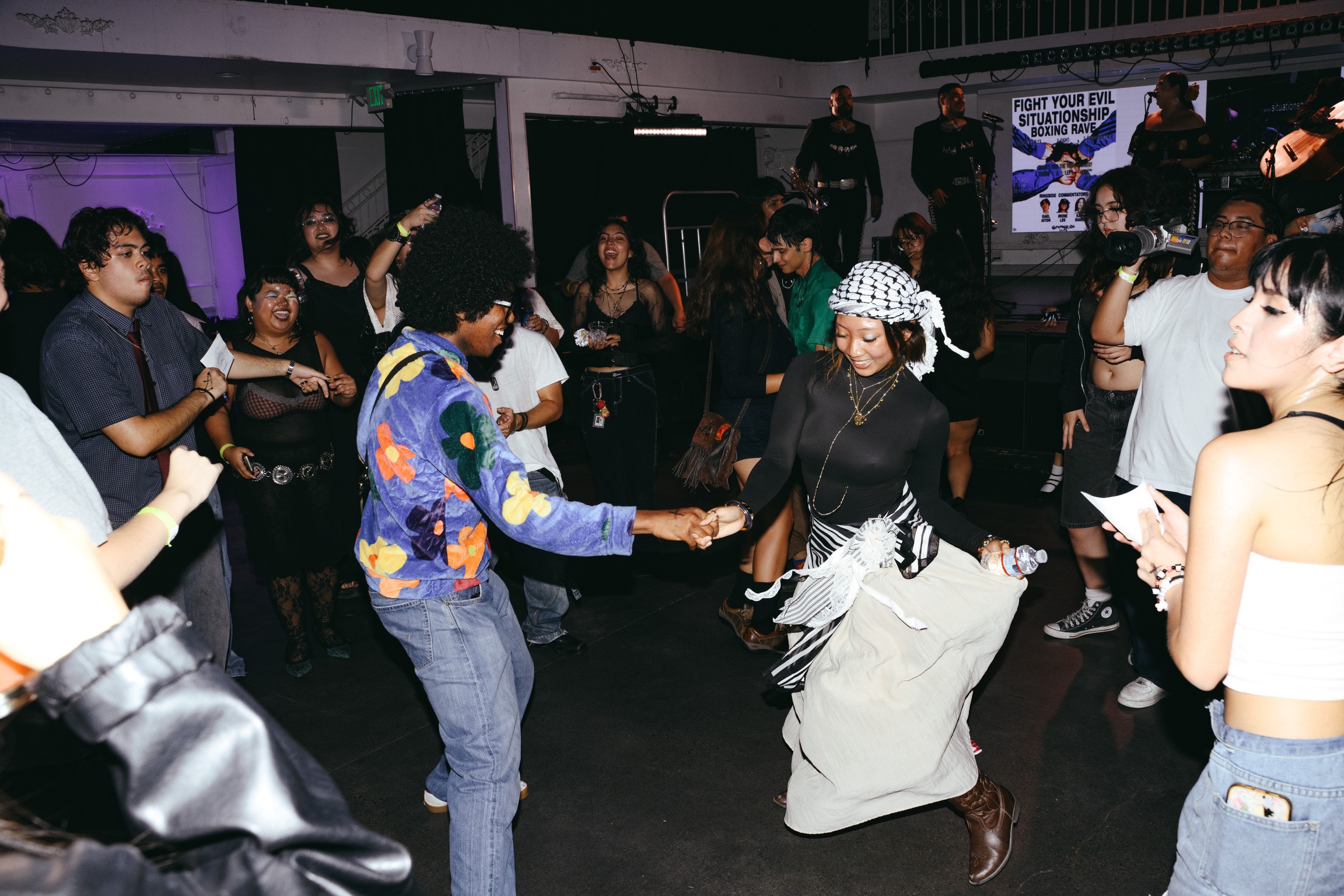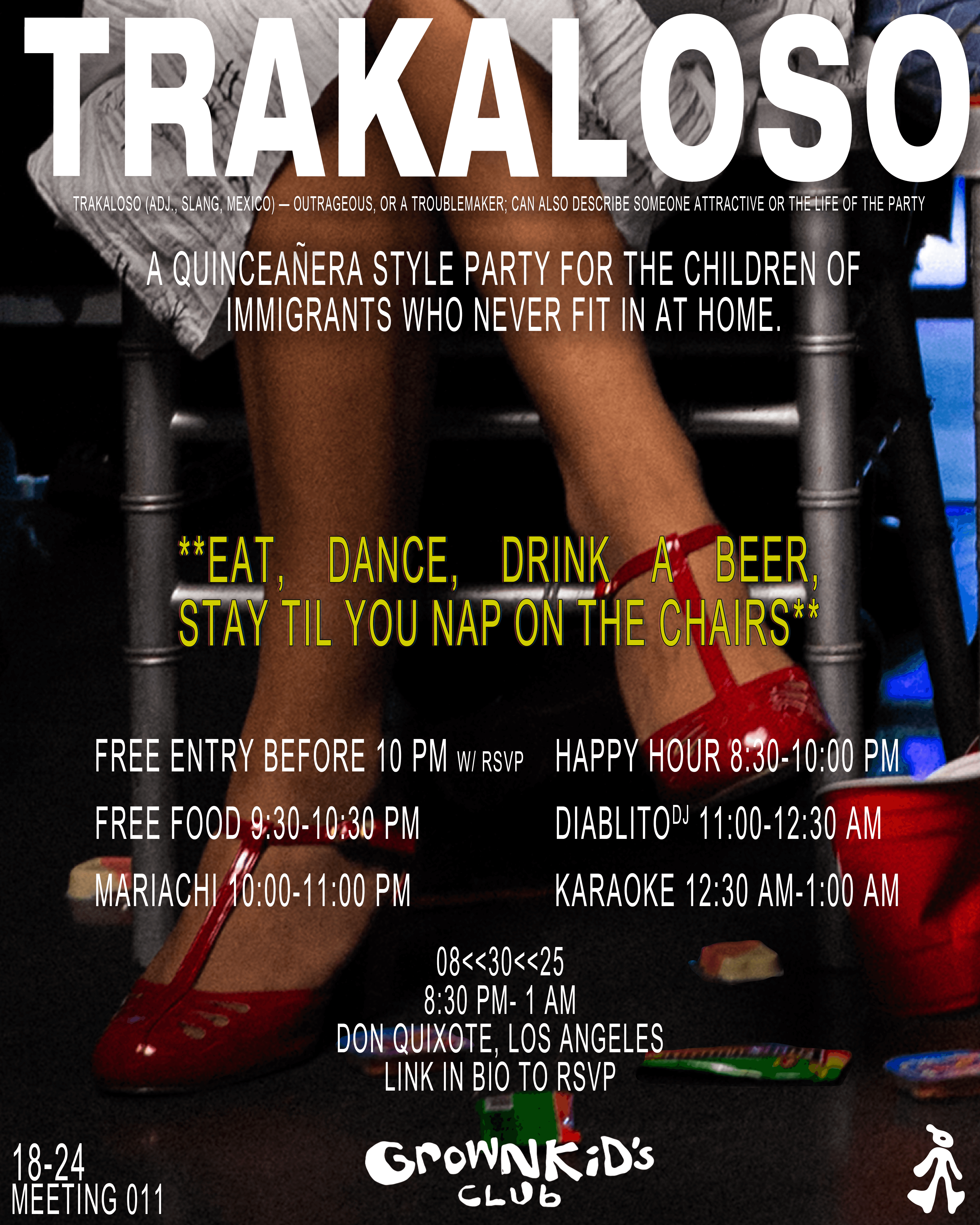 imagine a dance floor filled with emos, rockeros, and every genre of kid who never saw themselves in a traditional party. quinceañera style tables line the edge of the dance floor, covered in scattered Mexican candies and chips, while warm plates of birria, rice, and beans make their way around the room. people drift between dancing, snacking, and drinking, and end the night passed out on folding chairs just like every childhood party we survived.